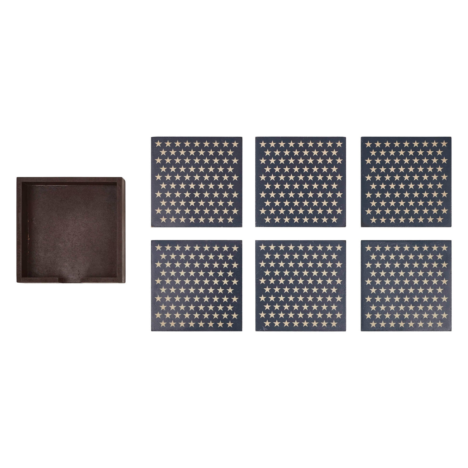 White Stars On Navy MDF Coaster w/ Container Set of 6 4x4